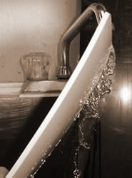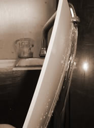 The “sticky spoon” refers to how well water is “sticking” to the back of the oar blade (the spoon) as the blade moves through the drive. We can demonstrate the sticky spoon effect by placing an oar blade under a running faucet.