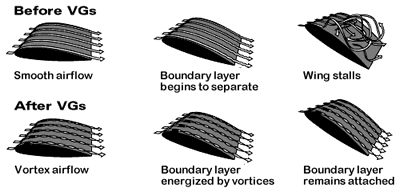 The diagram at right, from an article at avweb.com, illustrates how vortex generators (VGs) on airplane wings reduce drag and increase lift as the angle of attack increases.